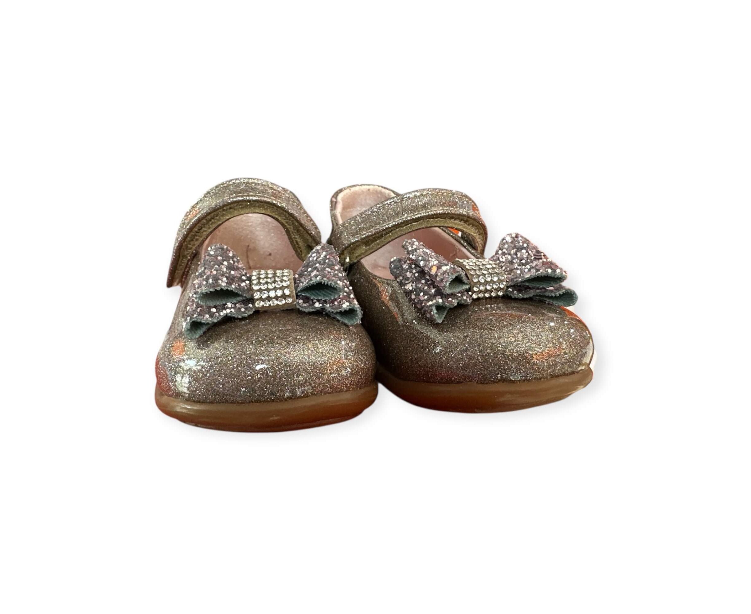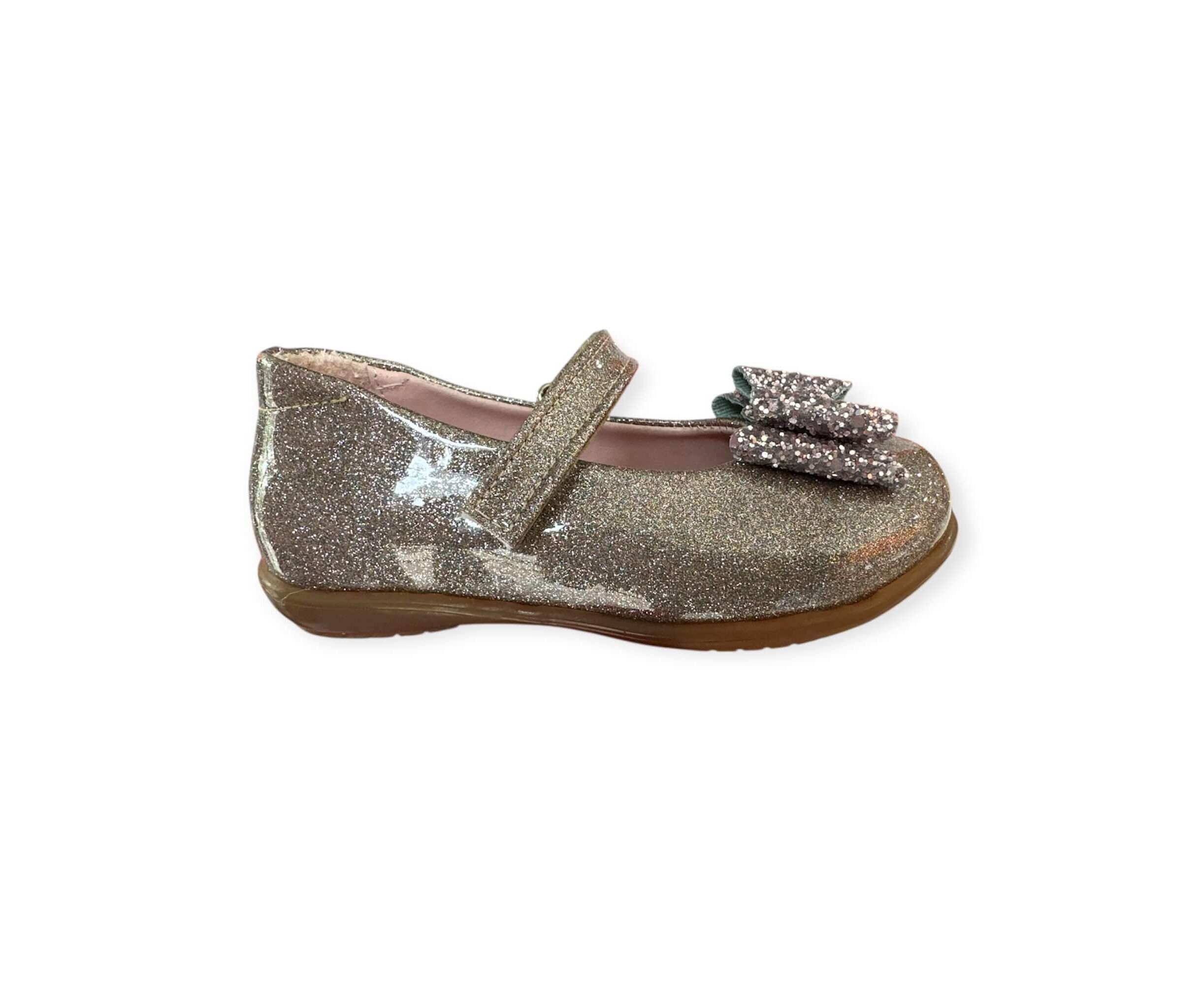 Παιδική μπαλαρίνα απο την εταιρεία Aby, σε μπέζ γκλίτερ λουστρίνι και με φιόγκο στρασάκια.