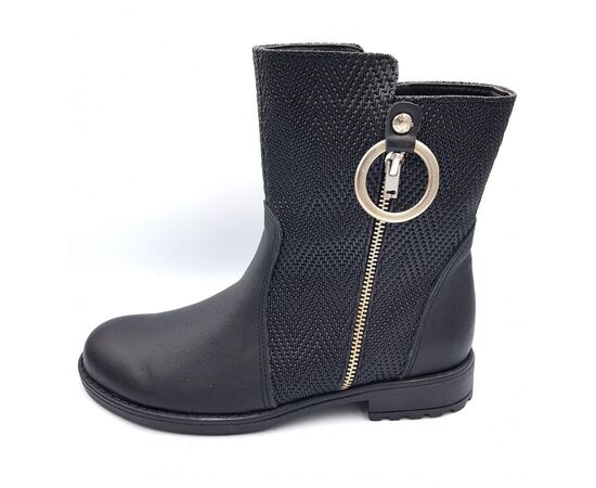 Παιδικό μποτάκι από την Aby για κορίτσια κατασκευασμένο από δέρμα. Διακοσμημένο με έναν μεταλλικό κρίκο και ένα διακοσμητικό μεταλλικό φερμουάρ στο πλάι. Εύκολη εφαρμογή με το μαύρο φερμουάρ στο πλάι, αδιάβροχη επένδυση για να κρατάει το πόδι στεγνό και ζεστό. Balloon Shoes - από το 1989 δίπλα σας.